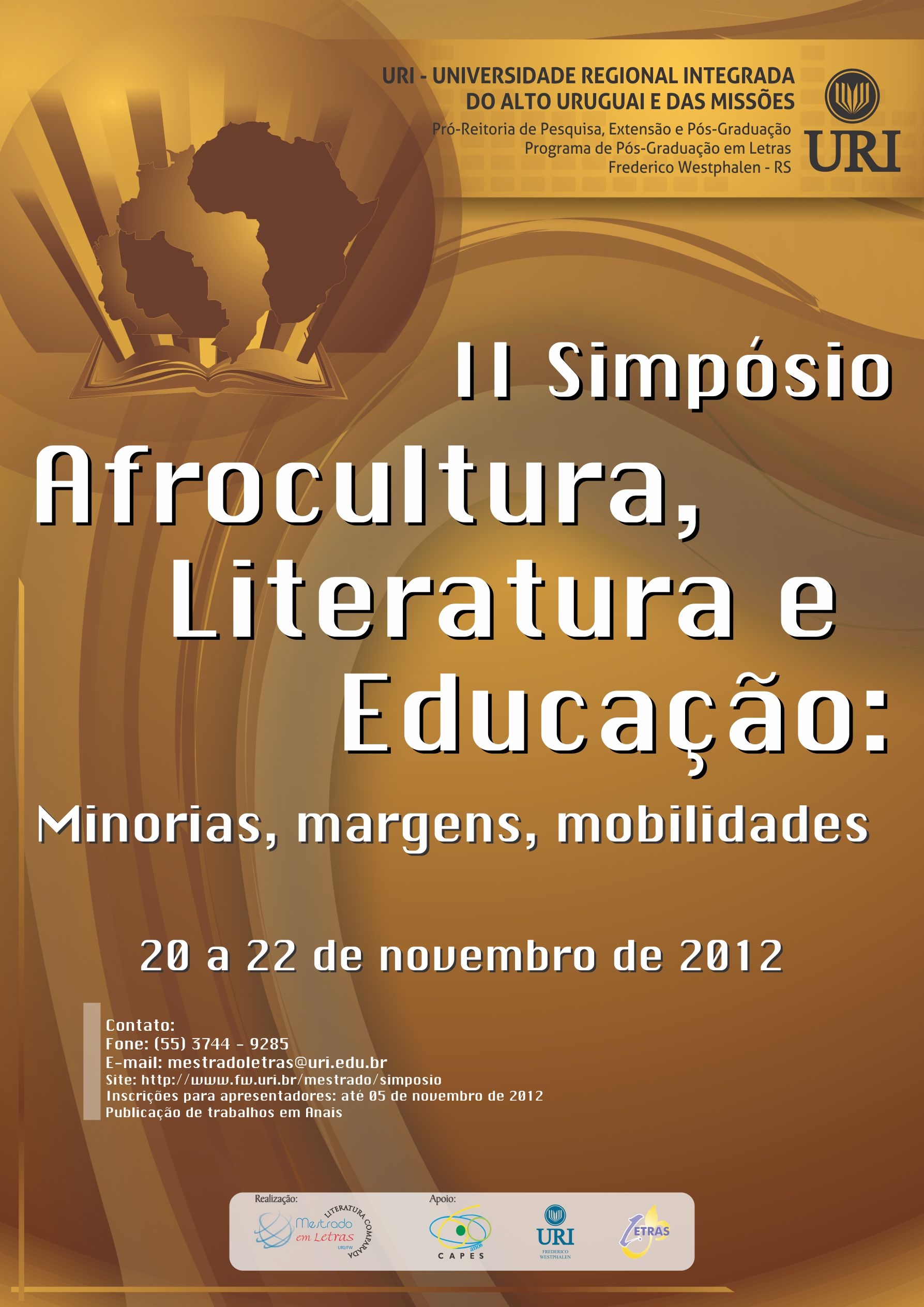 De 20 a 22 de novembro de 2012, será realizado o II Simpósio Afrocultura, Literatura, Educação, no campus da Universidade Regional do Alto Uruguai e das Missões (URI) na cidade de Frederico Westphalen, Rio Grande do Sul. A inscrição para apresentação de trabalhos segue até o dia 5 de novembro. A inscrição de ouvinte pode ser feita até o dia 16 de novembro. O encontro acadêmico é realizado pela URI – Frederico Westphalen e o PPG Mestrado em Letras- Literatura Comparada.