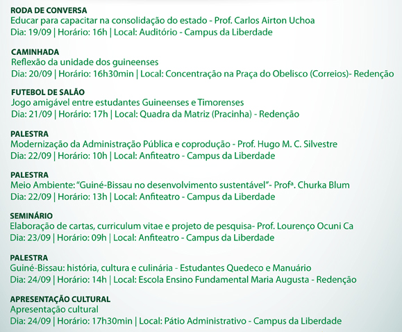 A programação iniciará no próximo dia 19, às 16h, no Auditório do Campus da Liberdade, em que os estudantes vão discutir o tema “Educar para capacitar na consolidação do Estado”. O encontro será mediado pelo professor do Instituto de Ciências Sociais Aplicadas, Carlos Airton Uchoa Sales Gomes. Na ocasião, os alunos se dividirão em grupos para debater pontos referentes à educação no país. A ideia é que os participantes elaborem um documento para ser entregue ao governo guineense.