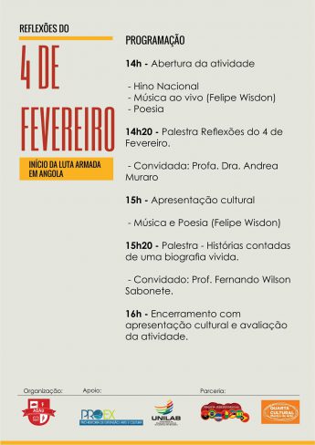 Para lembrar, celebrar e debater a data, a Associação dos Estudantes Angolanos da Unilab realiza uma série de atividades nesta sexta-feira (3), às 14 horas, no auditório do bloco administrativo da Unilab, no Campus da Liberdade, em Redenção/CE. Haverá música, poemas e as palestras “Reflexões do 4 de fevereiro”, com a professora Andrea Muraro, e “Histórias contadas de uma biografia vivida”, proferida pelo docente Fernando Sabonete.