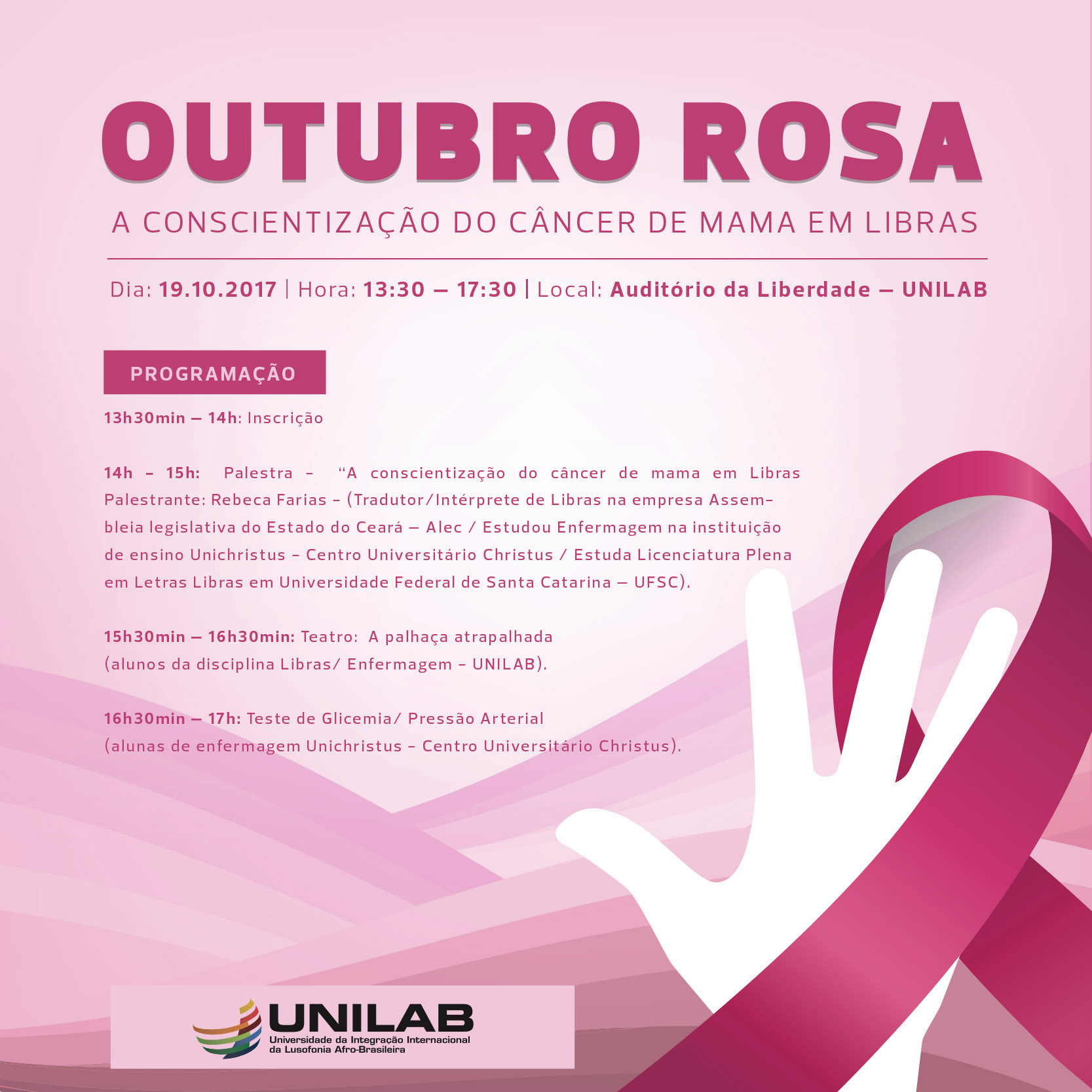 Já no dia 19, a partir das 13h30, ocorre o evento “Outubro Rosa – a conscientização do câncer de mama em Libras”, com palestra em Libras, peça de teatro e teste de glicemia e pressão arterial. Veja:
