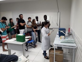 Em seguida, os discentes são encaminhados para uma triagem epidemiológica, sendo realizada avaliação física com coleta de dados antropométricos (peso, altura, circunferência abdominal) e sinais vitais. Depois, o enfermeiro ou o médico faz uma consulta com o objetivo de identificar sinais e sintomas de doenças comuns nos países de origem, além de avaliarem as condições de saúde do discente no momento.