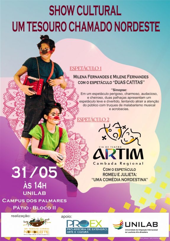 Nesta sexta-feira (31), das 9h às 16h, o projeto “Um tesouro chamado Nordeste”, vinculado a Pró-Reitoria de Extensão, Arte e Cultura (Proex/Unilab), vai promover o “Show Cultural do Tesouro chamado Nordeste” na Unidade Acadêmica dos Palmares, em Acarape/CE.