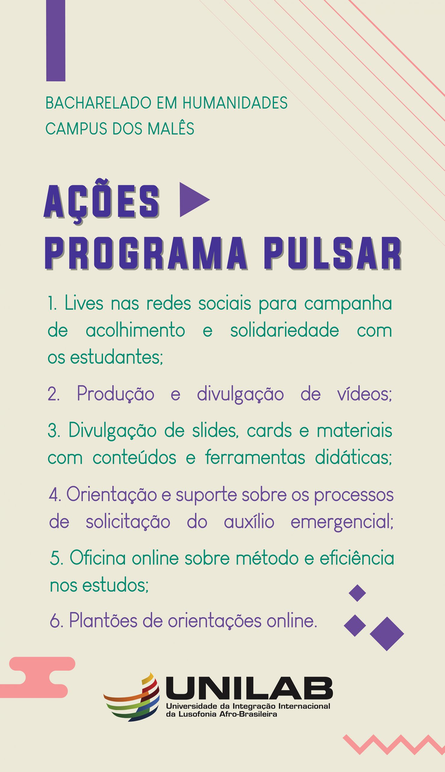 O Programa Pulsar é um programa de acompanhamento estudantil e orientação acadêmica voltado aos estudantes dos cursos de graduação da Unilab, na forma de ações de tutoria.