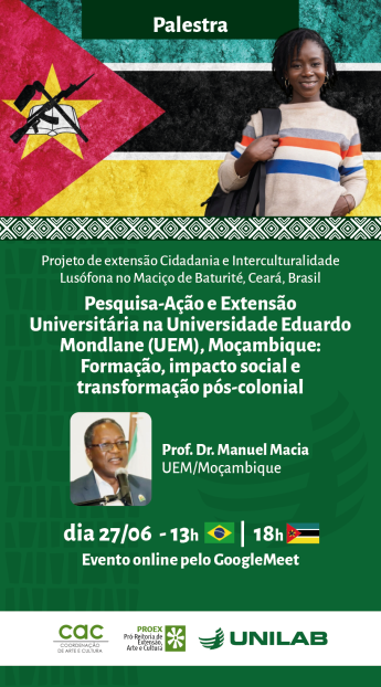 No dia 27 de junho, às 13h (horário Brasil)/18h (horário Moçambique), acontece palestra online intitulada “Pesquisa-Ação e Extensão Universitária na Universidade Eduardo Mondlane (UEM), Moçambique: formação, impacto social e transformação pós-colonial”, com o professor da UEM/Moçambique Manuel Macia. A transmissão da palestra será pelo Google Meet, neste link.