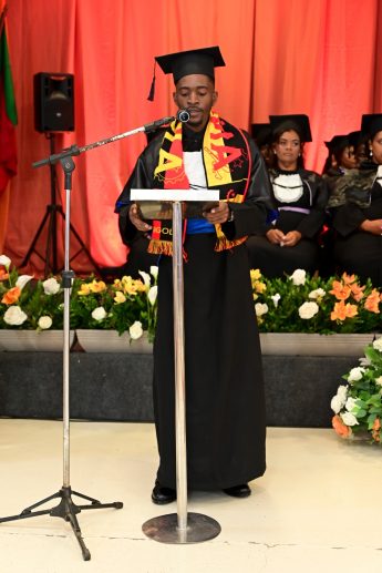 O orador do curso de bacharelado em Relações Internacionais Vasco Domingos Joaquim Zamba, por sua vez, trouxe na sua fala o percurso de desafios e dificuldades – sobretudo na área de estágio – e trouxe um olhar humanista sobre a missão dos novos formandos. “Formar-se não é apenas conquistar um título. É aprender a se levantar após cada tropeço, é amadurecer diante dos desafios, é entender que conhecimento não se guarda se compartilha. E é com esse espírito que saímos daqui. Não apenas profissionais capacitados, mas cidadãos conscientes, prontos para construir, questionar, inovar e, como internacionalistas, perceber as mudanças do sistema internacional torna-se obrigatório”, apontou.