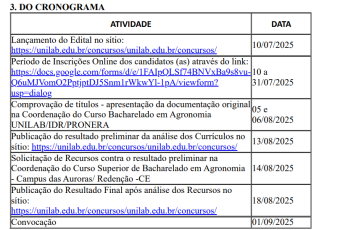 Nesta quarta-feira (16), o Instituto de Desenvolvimento Rural (IDR) da Universidade da Integração Internacional da Lusofonia Afro-Brasileira (Unilab) divulgou o Termo Aditivo – Revisão, referente ao Edital nº 09/2025 – processo de seleção de bolsistas para atuar como apoio pedagógico e monitoria, para atuar no Curso Bacharelado em Agronomia, vinculados ao Programa Nacional de Educação na Reforma Agrária (Pronera).