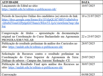 Conforme EDITAL UNILAB/IDR/PRONERA 09/2025, o IDR/Unilab torna pública a abertura de inscrições para o processo de seleção simplificado para comunidade externa para o encargo de Técnico de Apoio Acadêmico e Administrativo e Monitores, para atuar no Curso Bacharelado em Agronomia, vinculados ao Programa Nacional de Educação na Reforma Agrária – PRONERA, As inscrições devem ser feitas até o dia 21 de julho, por meio de formulário eletrônico, neste link, anexando todos os documentos exigidos no edital.