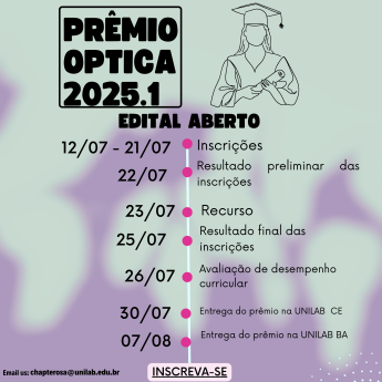 Até o dia 21 de julho, estão abertas as inscrições para a 4ª edição do Prêmio Optica – uma iniciativa da Unilab Student Chapter, que é um projeto formado por professores e estudantes da Unilab, com o objetivo de promover a excelência acadêmica e incentivar a participação dos estudantes em projetos de pesquisa e extensão. O prêmio busca homenagear aqueles estudantes que, ao longo de sua trajetória acadêmica, conseguiram se engajar de forma bem-sucedida nessas atividades, contribuindo para o cumprimento dos objetivos da Unilab.