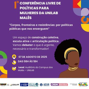 Acontece no dia 07 de agosto a 1ª Conferência Livre de Políticas para as Mulheres, evento que será realizado das 8h às 18h, no Auditório do Campus dos Malês. Conferência é aberta a toda comunidade acadêmica, movimentos sociais e demais  pessoas interessadas. Com o tema Corpos, fronteiras e resistências: por políticas públicas que nos enxerguem, este evento integra a etapa preparatória da 5ª Conferência Nacional de Políticas para as Mulheres (CNPM), cujo lema é Mais Democracia, Mais Igualdade e Mais Conquistas para Todas. A