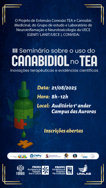 A Universidade da Integração Internacional da Lusofonia Afro-Brasileira (Unilab), por meio do projeto de extensão Forbio, recebe no dia 21 de agosto o III Seminário sobre o uso de Canabidiol no Transtorno do Espectro Autista (TEA), realizado por pesquisadores da Uece. O Seminário, que tem como tema “Inovações Terapêuticas e Evidências Científicas”, acontecerá no auditório da Unilab, no Campus das Auroras, das 8h às 12h. O evento tem como objetivo promover a disseminação de informações científicas e acessíveis sobre o uso do Canabidiol (CBD) no TEA, assim como fortalecer o diálogo entre universidade e sociedade, promovendo o enfrentamento da desinformação sobre o tema.