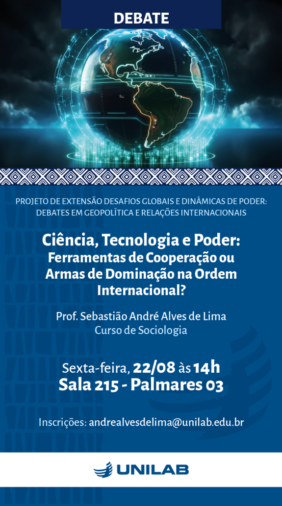 Participe do debate sobre: “Ciência, Tecnologia e Poder: Ferramentas de Cooperação ou Armas de Dominação na Ordem Internacional?”, nesta sexta-feira (22), às 14h, na sala 215, bloco III, da Unidade Acadêmica dos Palmares, em Acarape/CE.