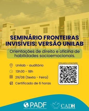 A Seção de Políticas Estudantis (Sepe/Unilab), em parceria com o Centro Aplicado de Direitos Humanos (CADH), convida a comunidade estudantil do Campus dos Malês para participar do Seminário Fronteiras Invisíveis, que ocorrerá nesta sexta-feira, 29 de agosto, às 13h30, no Auditório da Unilab – Campus dos Malês.