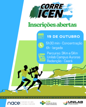 No dia 19 de outubro acontece a Corrida Internacional das Ciências Exatas e da Natureza – CORRE ICEN, no município de Redenção/CE, com concentração às 5h30 e largada às 6h, em frente ao campus Auroras da Universidade da Integração Internacional da Lusofonia Afro-Brasileira (Unilab). O evento tem como finalidade promover a prática esportiva, a integração universitária e comunitária, além de incentivar hábitos de vida saudável.