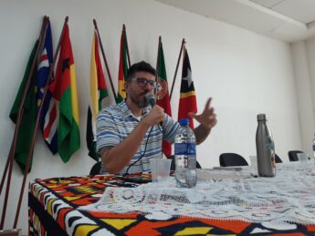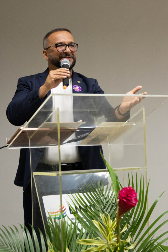 A gente não pode ficar pra trás, a gente precisa trazer isso, mas nós temos um papel social muito importante e temos algumas barreiras e riscos que a gente precisa estar muito cientes. Que nesta Semuni, não sejamos artificiais e que usemos de todas as características, todas as formas, para entender o nosso compromisso de continuar fazendo ciência, ciência de qualidade, e nessa universidade, atento a toda promoção que tenta nos colocar à parte, nos tornar desiguais, ou praticar qualquer racismo. Essa é a Universidade da Integração Internacional da Lusofonia África Brasileira.” – Roque Albuquerque, reitor da Unilab
