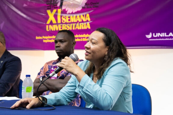 Na mesa de abertura, a diretora do Instituto de Humanidade e Letras (IHL) Carla Verônica também destacou a construção coletiva da Semana e a importância da discussão deste ano sobre inteligência artificial, além das diversas temáticas que vão ser abordadas na Semuni, que trazem trabalhos de 7 cursos de graduação do campus baiano da Unilab. “Que seja uma semana que tenha a ‘cara’ dos Malês, que represente também os Malês”, disse. “A universidade é pesquisa, extensão, convivência, é troca, são os aprendizados que a gente constrói, que a gente publiciza e troca”, complementou.