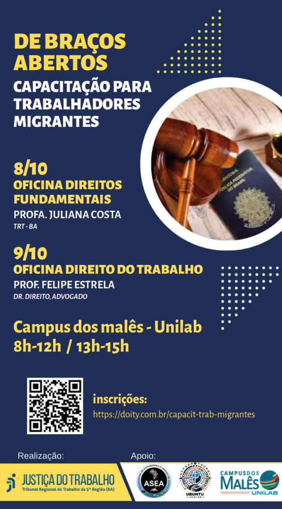 Nesta quarta e quinta-feira (8 e 9), será realizado o evento “De Braços Abertos – Capacitação para Trabalhadores Migrantes”, no Campus dos Malês/Unilab, em São Francisco do Conde, na Bahia, durante os turnos da manhã e tarde (8h às 12h e 13h às 15h).