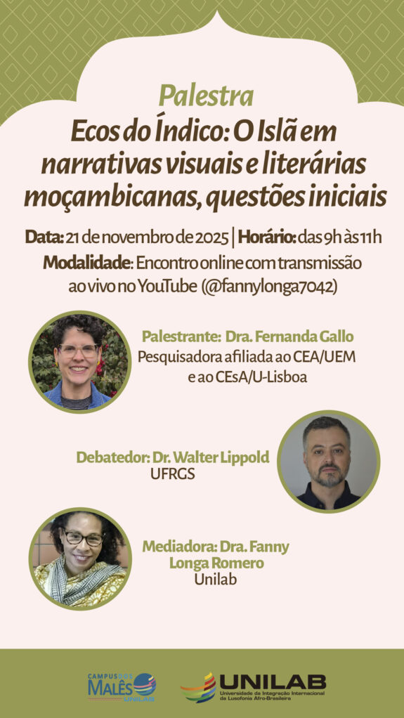A palestra “Ecos do Índico: o Islã em narrativas visuais e literárias moçambicanas, questões iniciais” ocorre na próxima sexta-feira, 21 de novembro, às 9 horas, on-line. Inscreva-se neste formulário e assista neste canal no YouTube. Haverá certificado.