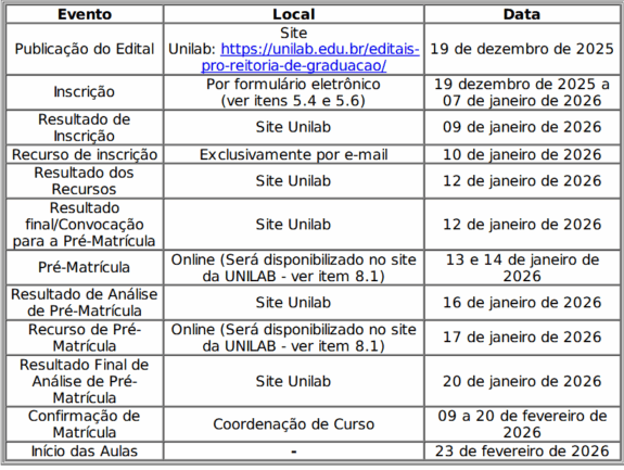 Todas as informações sobre esse processo seletivo encontram-se no edital 28/25, anexos e outros documentos, que encontram-se abaixo ou na página https://unilab.edu.br/editais-pro-reitoria-de-graduacao/