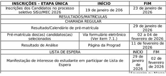 As inscrições para participação no Sisu serão efetuadas exclusivamente pela internet, por meio do endereço eletrônico https://acessounico.mec.gov.br/sisu, o qual ficará disponível para inscrição dos (as) candidatos (as) no período de 19 de janeiro de 2026 até as 23 horas e 59 minutos de 23 de janeiro de 2026.