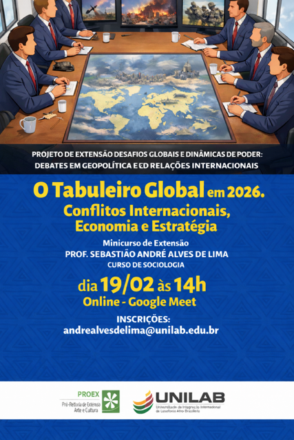 Estão abertas as inscrições para o minicurso online O Tabuleiro Global em 2026: Conflitos Internacionais, Economia e Estratégia – evento que acontece dia 19 de fevereiro, às 14 horas, pelo Google Meet. As inscrições devem ser feitas pelo e-mail andrealvesdelima@unilab.edu.br. No total estão sendo ofertadas 60 vagas.  O projeto de extensão Desafios Globais e Dinâmicas de Poder: Debates em Geopolítica e Relações Internacionais, coordenado pelo professor Sebastião André Alves de Lima, do curso de Sociologia da Unilab, promove o minicurso.