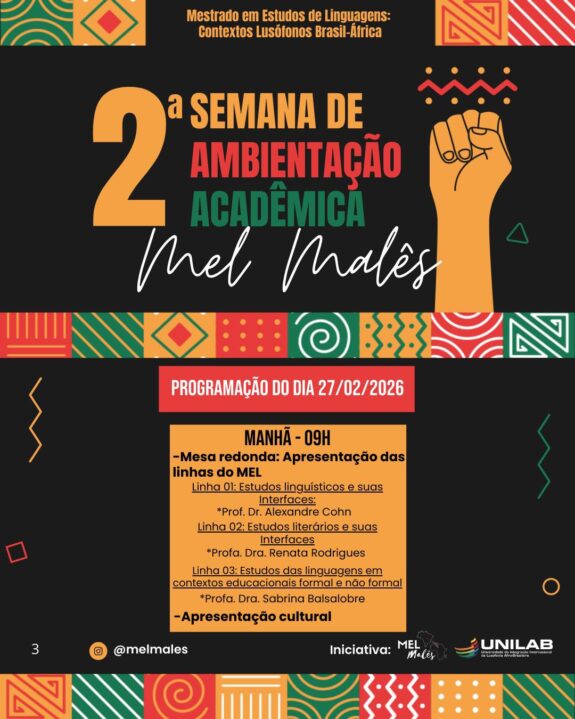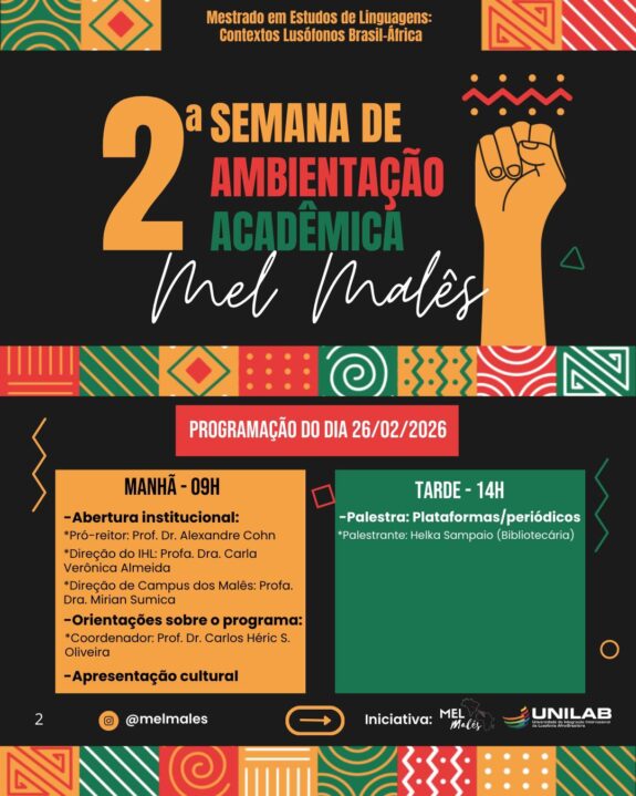 Nos dias 26 e 27 de fevereiro acontece a segunda edição do Samba Mel Malês – Semana de Ambientação Acadêmica da Pós-graduação do Campus dos Malês. O evento acontece no formato presencial, no campus dos Malês da Unilab, e é organizado pelo Mestrado em Estudos de Linguagens: Contextos Lusófonos Brasil-África (Mel).