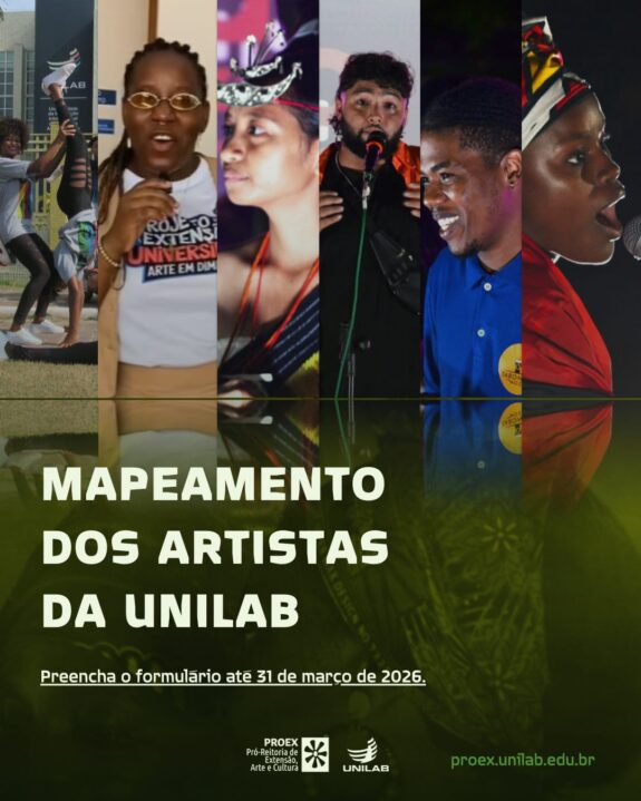A Universidade da Integração Internacional da Lusofonia Afro-Brasileira (Unilab), por meio da Coordenação de Arte e Cultura da Pró-Reitoria de Extensão (Proex), convida discentes, técnicas(os) administrativas(os), docentes e colaboradores terceirizados a participarem do Mapeamento de Artistas da Unilab!