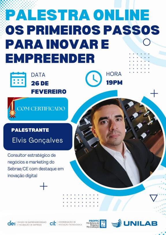 Nesta quinta-feira (26), às 19h, a Divisão de Empreendedorismo e Incubação de Empresas (DEI), vinculada administrativamente à Pró-Reitoria de Pesquisa e Pós-Graduação da Universidade da Integração Internacional da Lusofonia Afro-Brasileira (Proppg/Unilab), realizará a palestra on-line sobre: “Os Primeiros Passos Para Inovar e Empreender”, um momento formativo voltado ao fortalecimento da cultura da inovação e do empreendedorismo na universidade.