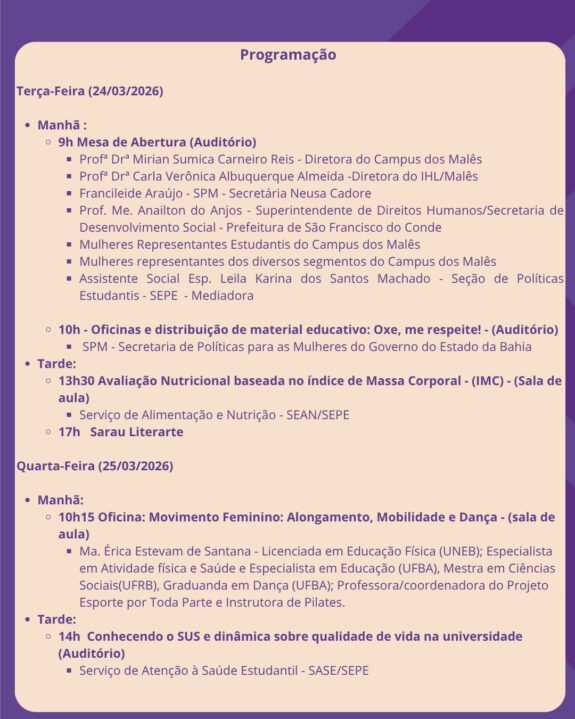 Na mesa de abertura, a diretora do campus dos Malês Mírian Reis falou da importância de eventos como esse em resposta a um anseio na universidade. “O que nós mulheres e homens do campus dos Malês temos feito para avançar na informação sobre direitos, em uma educação que realmente seja diversa do ponto de vista de gênero, raça e e religião; em uma educação que combata preconceitos e intolerância de todas as formas? Essas questões é o que nos motivam – sejam nos nossos currículos, sejam nos projetos de pesquisa, de extensão; elas ganham mais eco nesse mês de março, porque é um mês de lutas”, aponta.