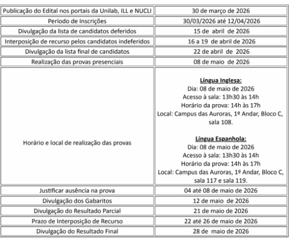 As provas de língua inglesa e de língua espanhola acontecem no dia 08 de maio de 2026, no campus das Auroras da Unilab.