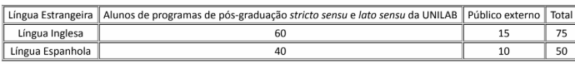 O Exame Presencial de Proficiência em Línguas Estrangeiras (EPPLEs) do NucLi está aberto aos discentes matriculados regularmente nos cursos de pós-graduação (stricto sensu e lato sensu) da Universidade da Integração Internacional da Lusofonia Afro-Brasileira (Unilab) e a membros da comunidade (público externo), também matriculados em programa de pós-graduação stricto sensu ou lato sensu da respectiva instituição de ensino superior, interessados em comprovar proficiência em leitura em Línguas Estrangeiras (Língua Inglesa ou Língua Espanhola), sendo as vagas divididas da seguinte forma: