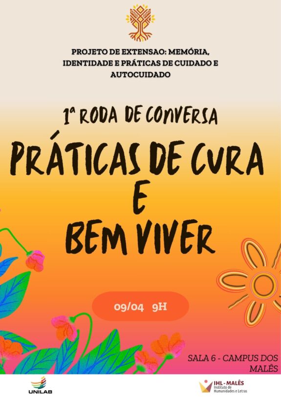 O Instituto de Humanidades e Letras (IHL), do Campus dos Malês, convida toda a comunidade acadêmica para participar da Roda Práticas de Cura e Bem Viver, do projeto de extensão: Memória, identidade e práticas de cuidado e autocuidado: confluências de saberes e práticas, que acontecerá na próxima quinta-feira, dia 09 de abril, a partir das 09h, na Sala 6 (Unilab/Malês).