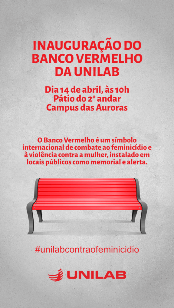 No dia 14/04, às 10h, no campus das Auroras, acontece inauguração do Banco Vermelho – símbolo internacional de combate ao feminicídio e à violência contra mulher