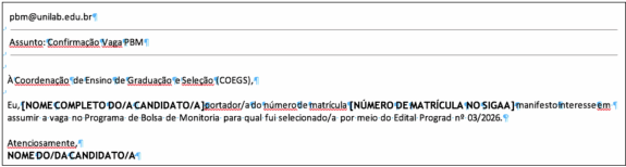 1.1. A mensagem de e-mail deve seguir o modelo de e-mail abaixo, apenas substituindo os campos em negrito pelos dados do/a candidato/a.
