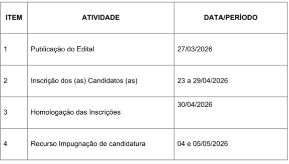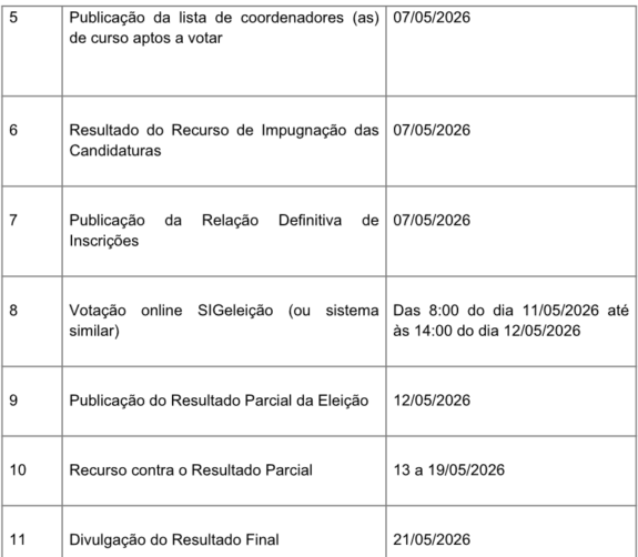 A lista de coordenadores (as) de curso de graduação aptos a votar será publicada no dia 07/05/2026 e a votação ocorrerá mediante voto secreto on-line no SIGEleição, ou outro similar, a partir das 08h00min do dia 11/05/2026 até as 14h00min do dia 12/05/2026, de acordo com o cronograma do edital: