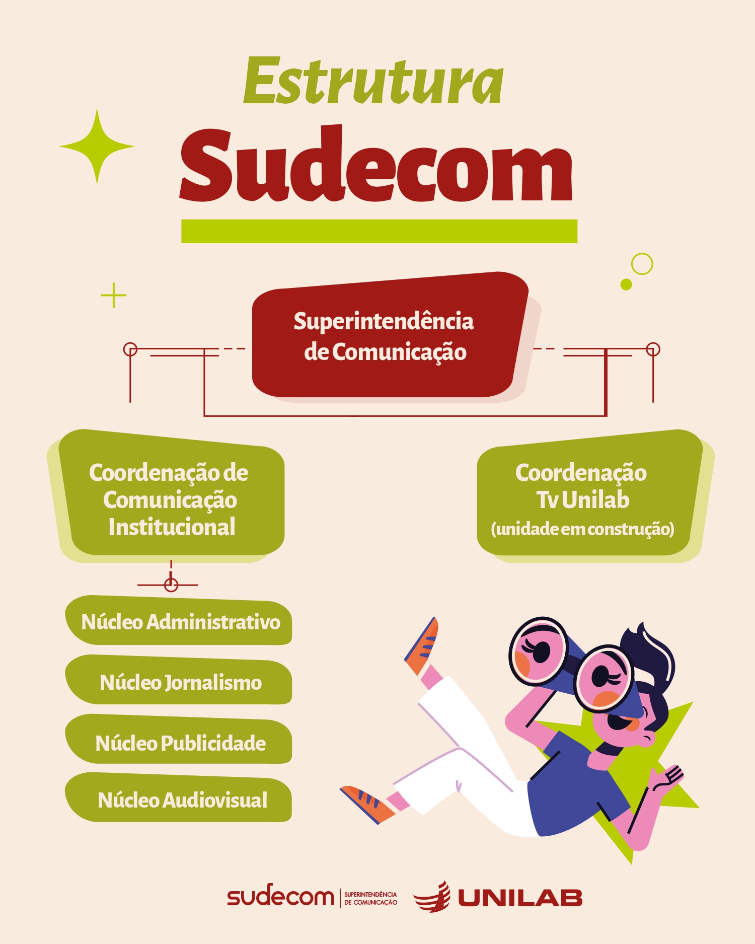 Passam a integrar a Sudecom a Coordenação de Comunicação Institucional(Secom), além de núcleos administrativos, de jornalismo, publicidade e audiovisual. A estrutura também inclui a TV Unilab, que está em fase de estruturação e, em breve, será mais uma importante ferramenta para fortalecer a comunicação da Unilab, com foco no ensino, na pesquisa e na extensão.