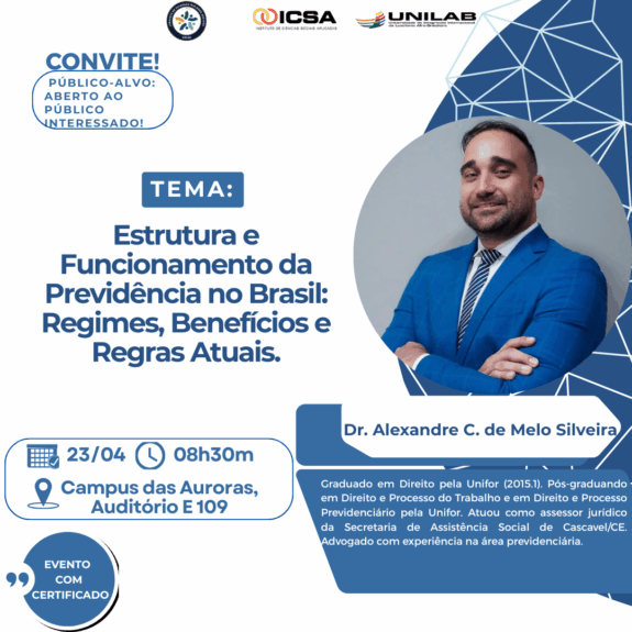 O Programa de Extensão do Instituto de Ciências Sociais Aplicadas (ICSA), da Universidade da Integração Internacional da Lusofonia Afro-brasileira (Unilab) convida toda a comunidade acadêmica para participar de uma palestra sobre “Estrutura e Funcionamento da Previdência no Brasil: Regimes, Benefícios e Regras atuais”, que vai acontecer na próxima quinta-feira, dia 23 de abril, a partir das 8h30, no Campus das Auroras – Auditório E109.