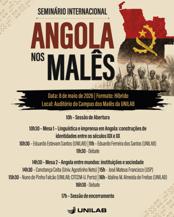 No dia 8 de maio, a partir das 10h, acontece o Seminário Internacional Angola nos Malês, , no auditório do campus dos Malês. O evento será realizado em formato híbrido e com participação de integrantes e pesquisadores da Unilab e de outras universidades.